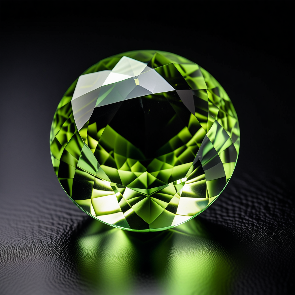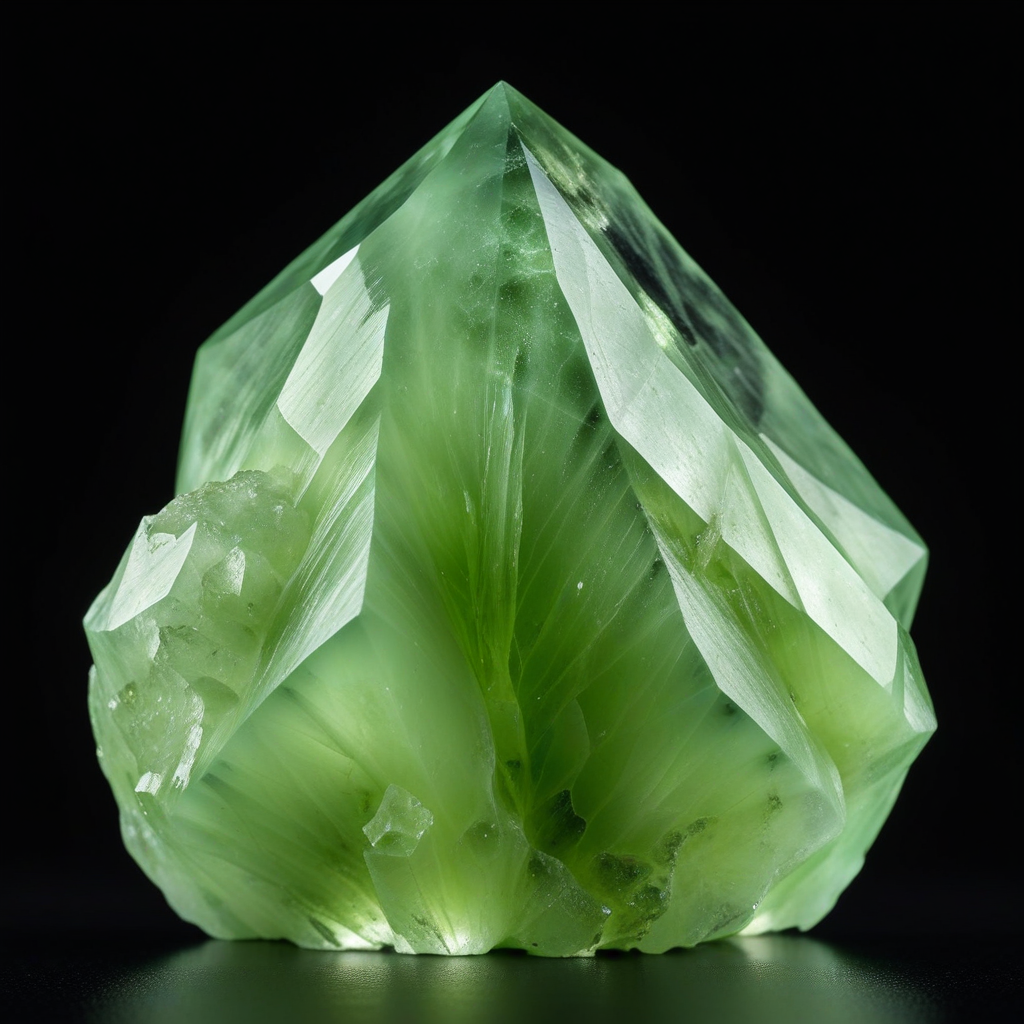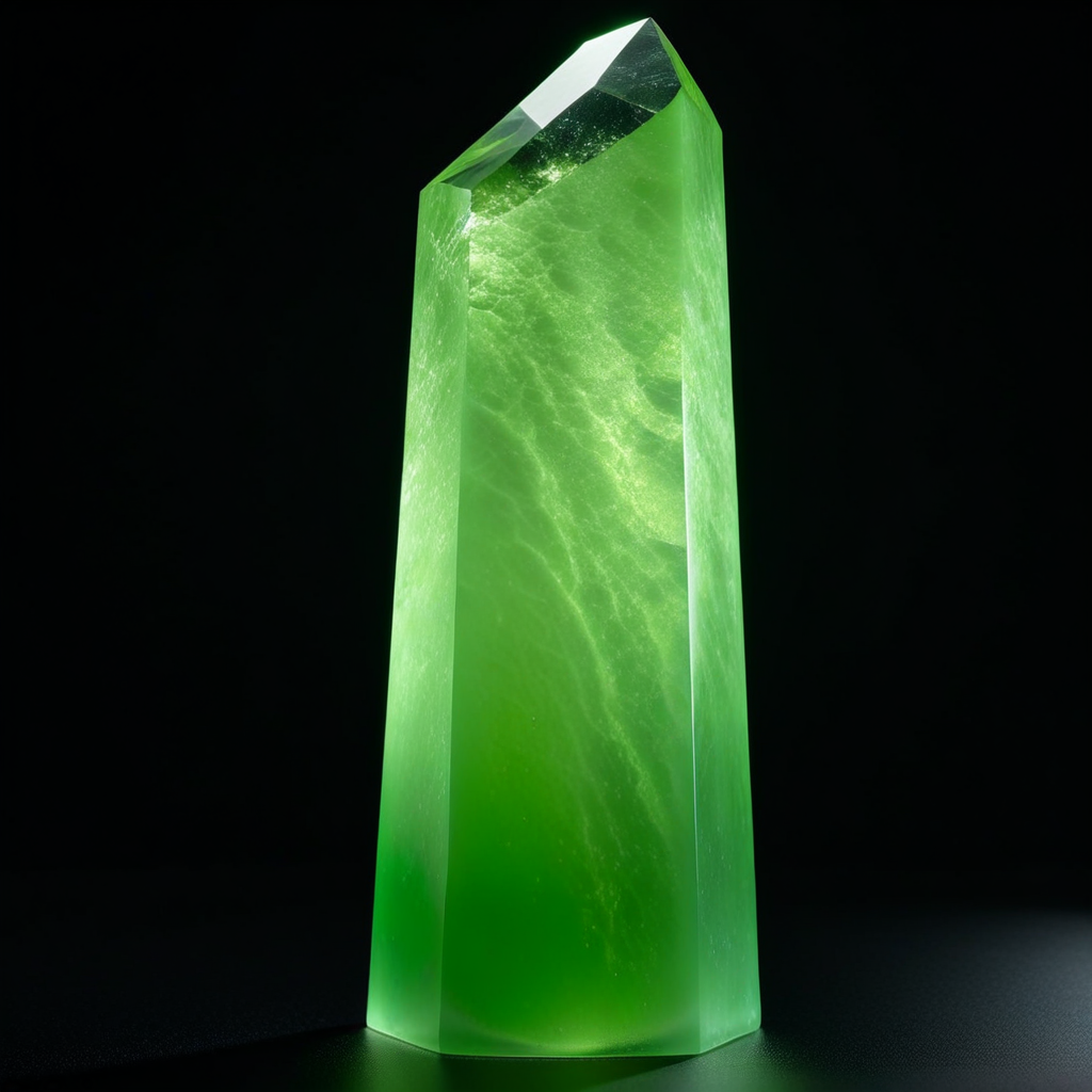 「淡い緑の静寂の中で、あなたの心に深い平和と予知の光をもたらす石。」